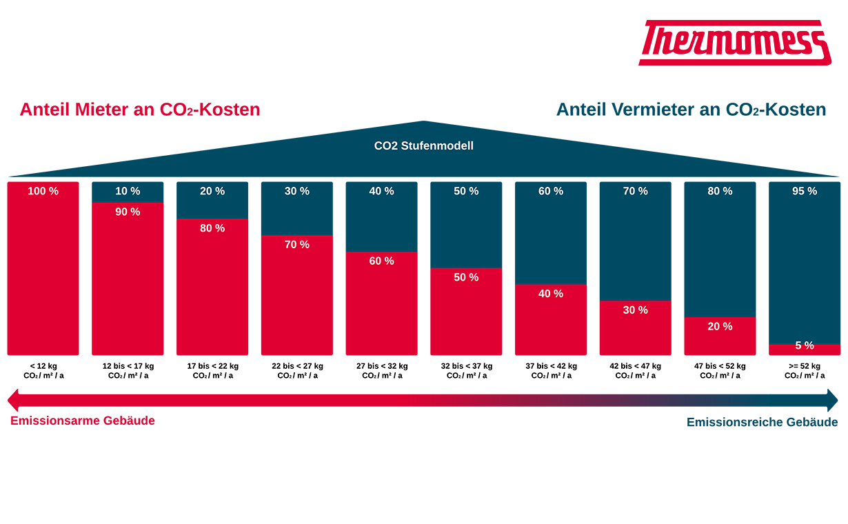 Für alle Abrechnungszeiträume ab dem 01.01.2023 gilt das CO2KostAufG. Dadurch sollen Eigentümer bei den Heizkosten und der Warmwasseraufbereitung ab 2023 anteilig am CO2-Preis beteiligt werden – abhängig von der Klimafreundlichkeit des Gebäudes. Für Wohngebäude gibt es hierfür ein 10-Stufenmodell für die Kostenaufteilung. Der Bundestag hat am 10.11.2022 einen entsprechenden Gesetzentwurf beschlossen. Je höher der CO2-Ausstoß eines Gebäudes ist, desto mehr zahlen die Vermieter, je besser die Energieeffizienz desto mehr die Mieter. Wer mit Öl oder Gas heizt, muss seit 2021 eine zusätzliche Abgabe zahlen, die helfen soll, den CO2-Ausstoß in Gebäuden zu senken. Bislang geht das allein auf Kosten der Mieter. In welche Stufe eine Mietwohnung fällt, hängt auch mit der Heizkostenabrechnung zusammen. Auf Vermieter kommt dadurch ein Mehraufwand zu, da sie Angaben etwa zur Energiebilanz und zum CO2-Ausstoß machen müssen, gleiches gilt für Thermomess, wenn wir die Berechnung der CO2 Anteile für die Kunden übernehmen sollen. Für jedes Haus muss nun ermittelt werden, wie klimafreundlich es ist. Bei Nichtwohngebäuden – etwa Gebäuden mit Geschäften und Büros – soll eine 50-50-Regelung gelten, es sei denn, Mieter und Vermieter vereinbaren es vertraglich anders. Bis Ende 2025 soll dann auch hier ein Stufenmodell entwickelt werden.